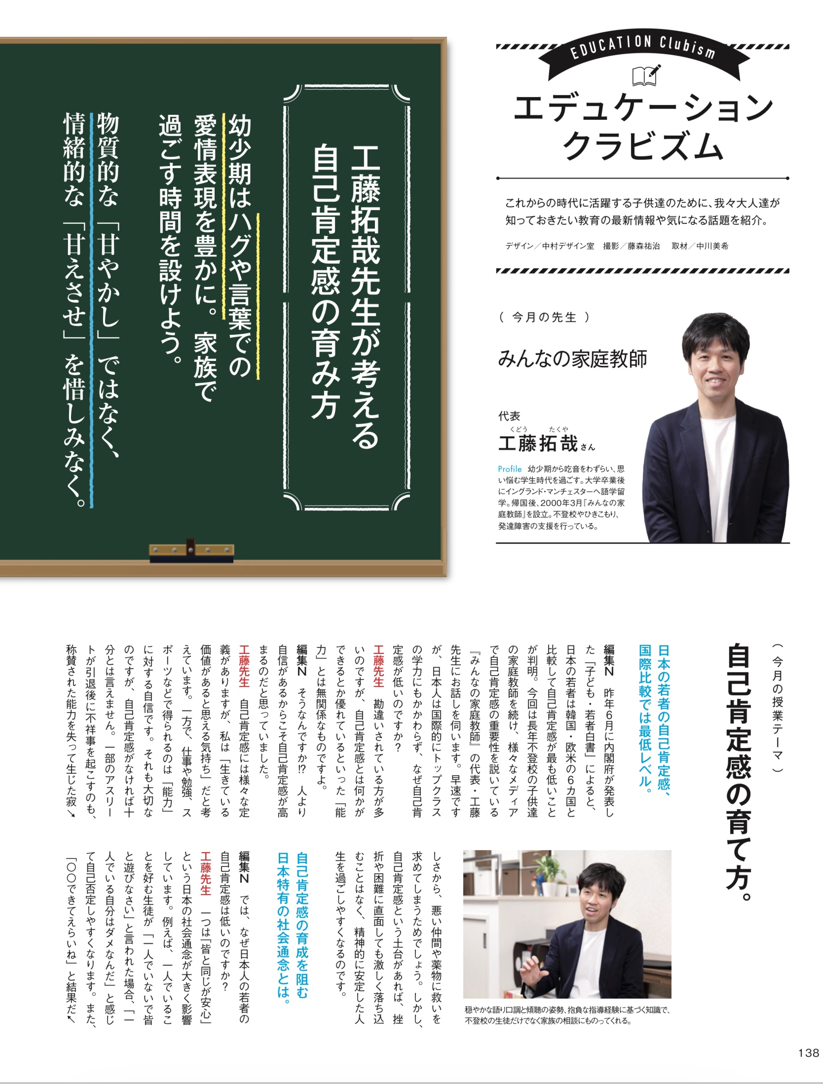 編集N 昨年6月に内閣府が発表した「子ども・若者白書」によると、 日本の若者は韓国・欧米の6カ国と比較して自己肯定感が最も低いことが判明。今回は長年不登校の子供達の家庭教師を続け、様々なメディアで自己肯定感の重要性を説いている 『みんなの家庭教師』の代表・工藤先生にお話を伺います。早速ですが、日本人は国際的にトップクラスの学力にもかかわらず、なぜ自己肯定感が低いのですか?